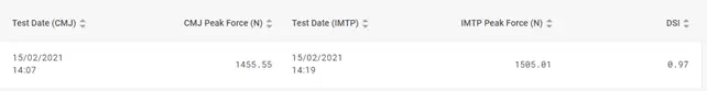 Rachel falls within the low DSI category, with a DSI value of 0.46. See below the raw scores from her testing data conducted using a CMJ and an IMTP. As you can see, the dynamic peak force expressed in the CMJ is relatively low when compared to the maximal force expression in the IMTP.