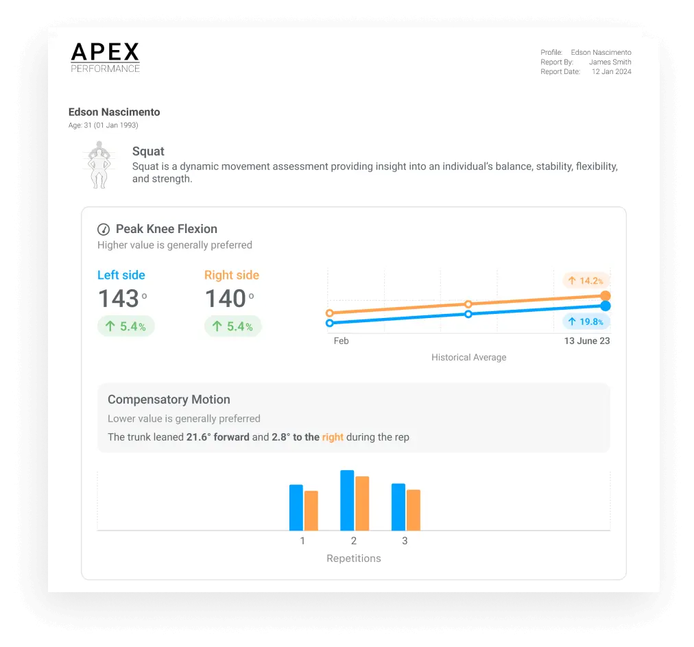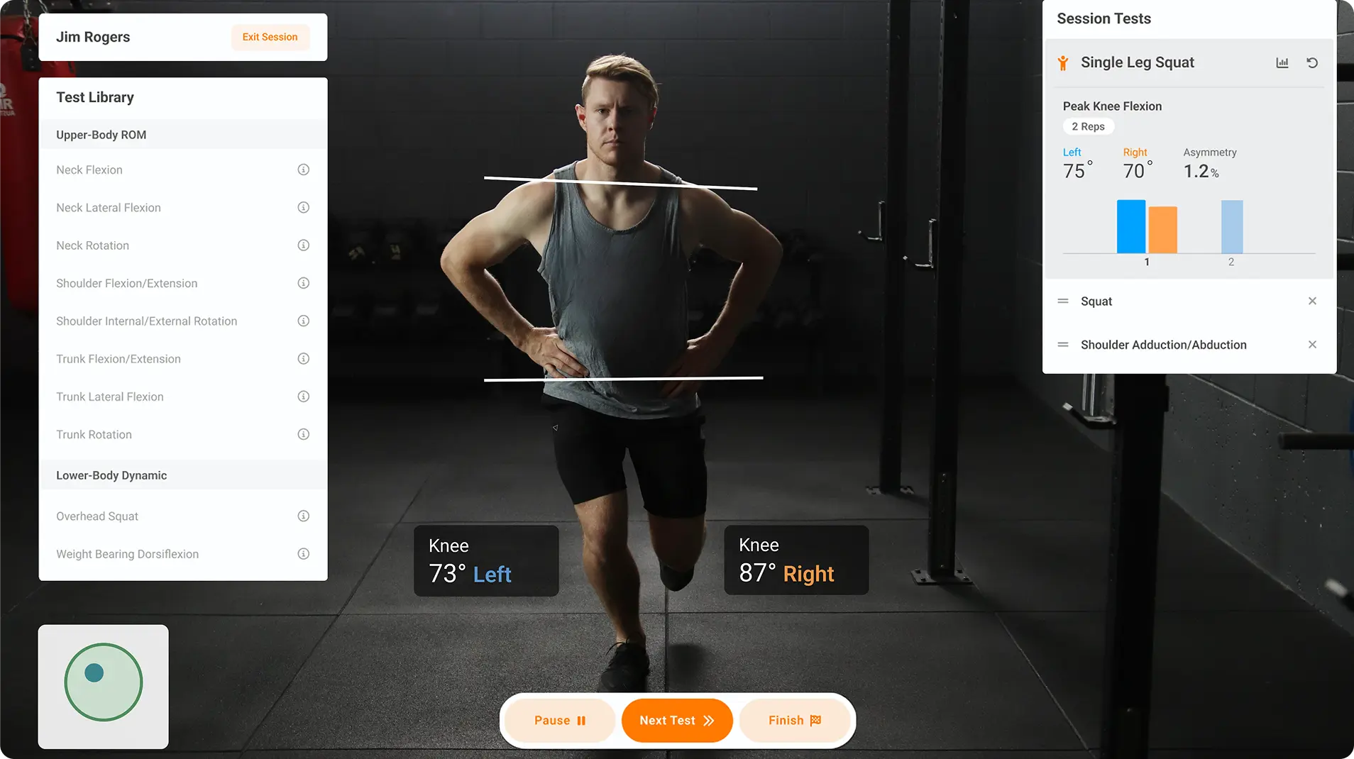 Évaluez en quelques secondes une série de mouvements courants à une ou plusieurs articulations et voyez les résultats de votre athlète s'afficher immédiatement. Testez plusieurs athlètes en succession rapide et générez des rapports individuels et de groupe attrayants et faciles à comprendre.