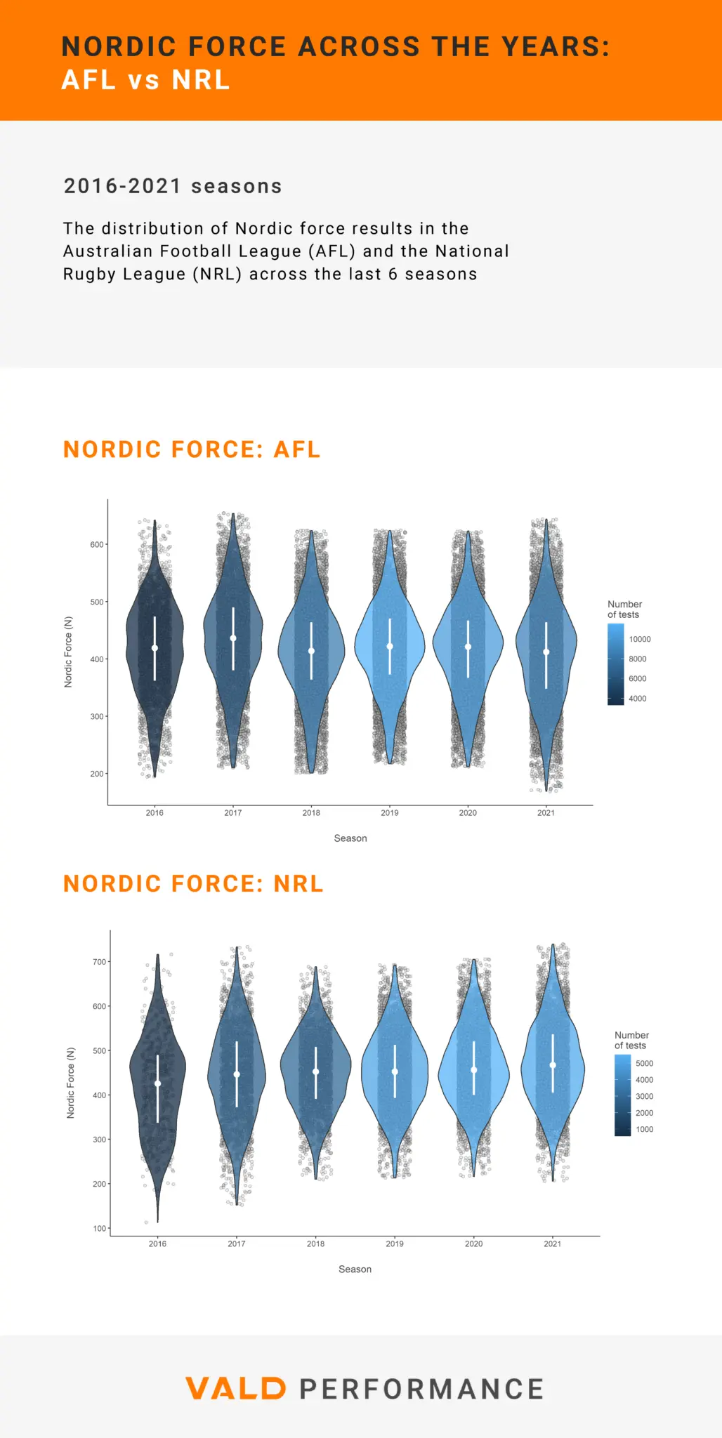 The following data are from more than 45,000 and 20,000 Nordic tests conducted in the Australian Football League (AFL) and the National Rugby League (NRL), respectively, since the introduction of VALD’s NordBord Hamstring Testing System in the 2016 season.