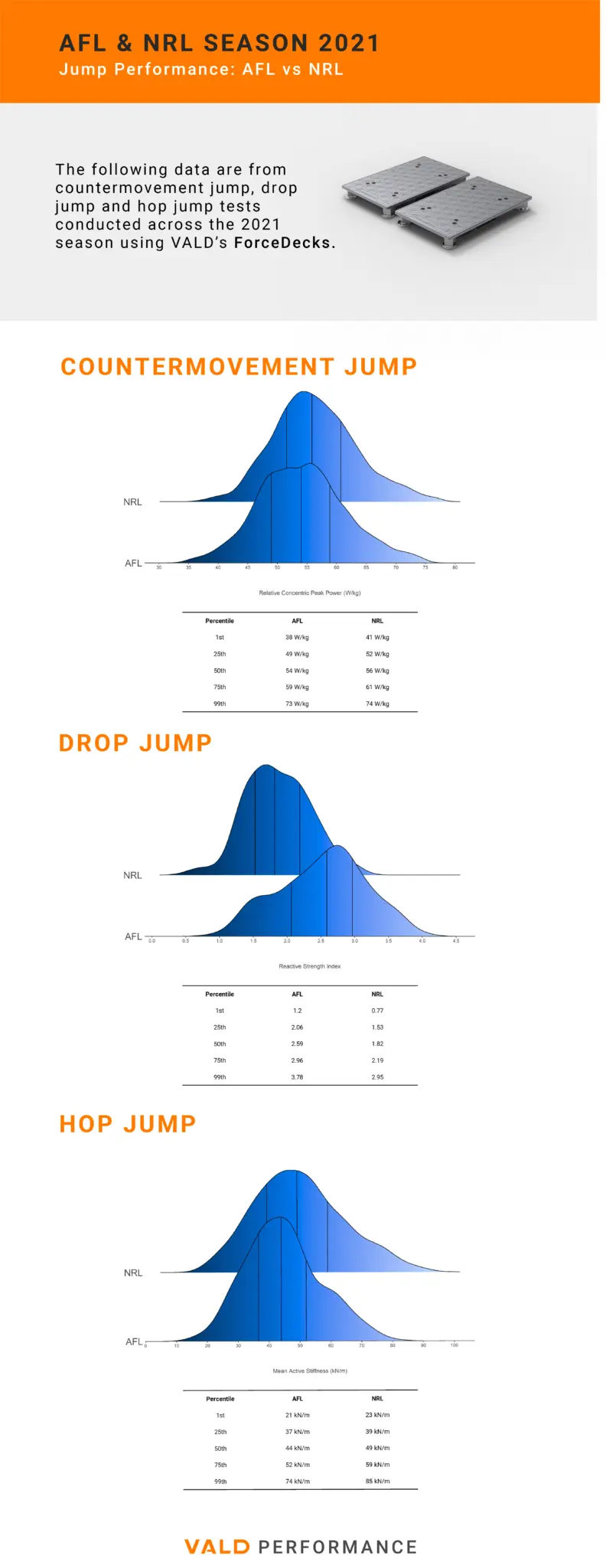 The following data are from countermovement jump, drop jump and hop jump tests conducted across the 2021 season using VALD’s ForceDecks Dual Force Plate System.