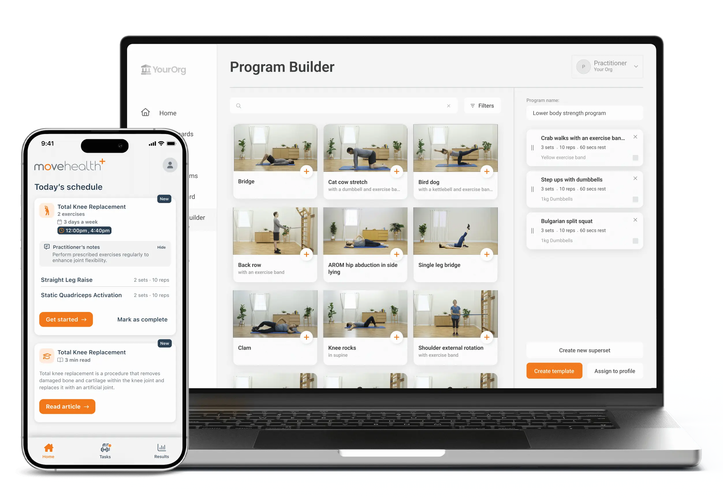 Build exercise programs with MoveHealth’s intuitive and flexible program builder, then prescribe them directly to your athlete’s iOS or Android device.
