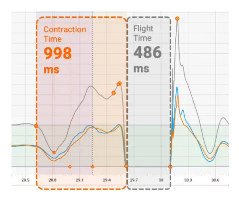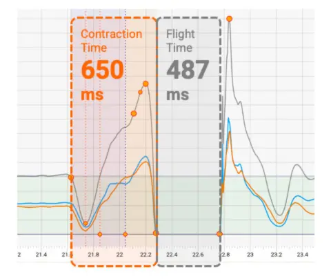 The jump and the phases therein are automatically detected by the software, and all metrics relevant to the jump are calculated instantaneously. For a CMJ, the contraction time begins as soon as movement is initiated and ends at the point of take-off. RSI-modified is the relationship between contraction time and jump height.