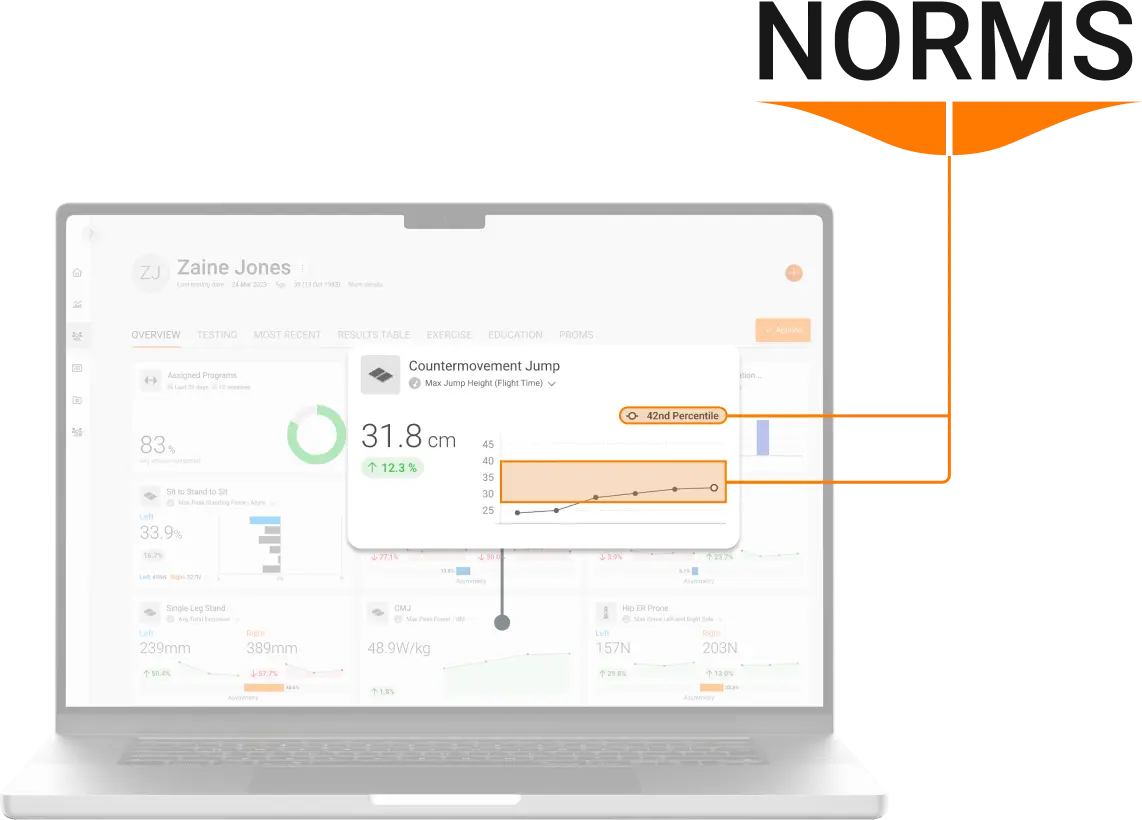 Force plates allow practitioners to make multiple types of comparisons with their client’s data. Side-to-side asymmetries allow for relative comparisons of how well one limb is performing an exercise compared to the other. Whereas normative datasets, such as VALD's Norms, allow practitioners to compare their client’s abilities to a reference standard that is compiled from millions of other test results from similar populations.