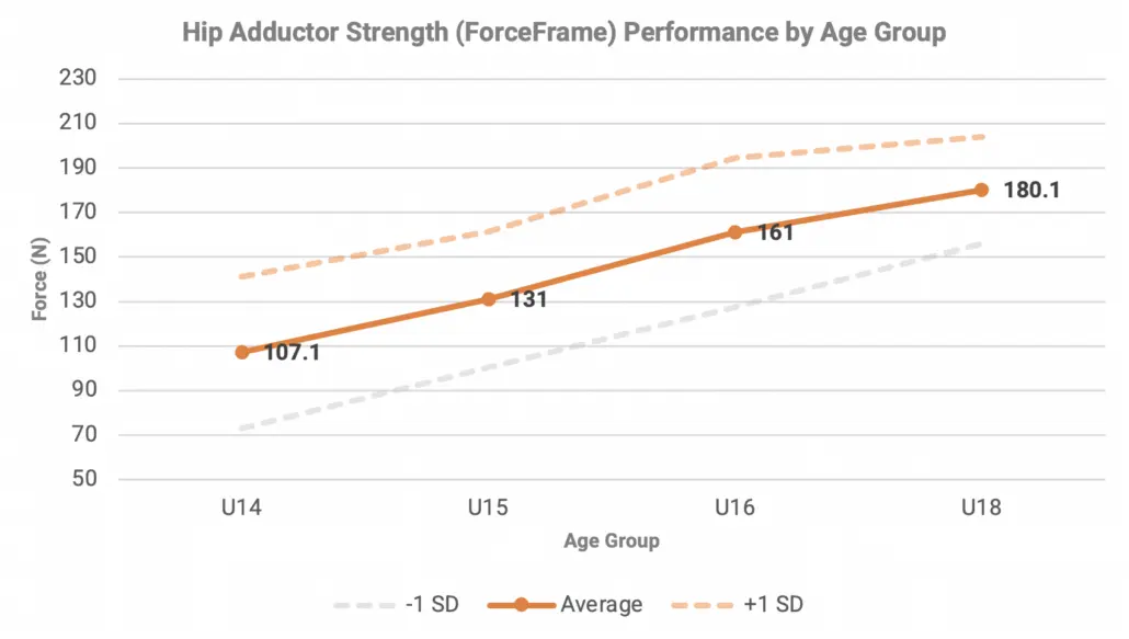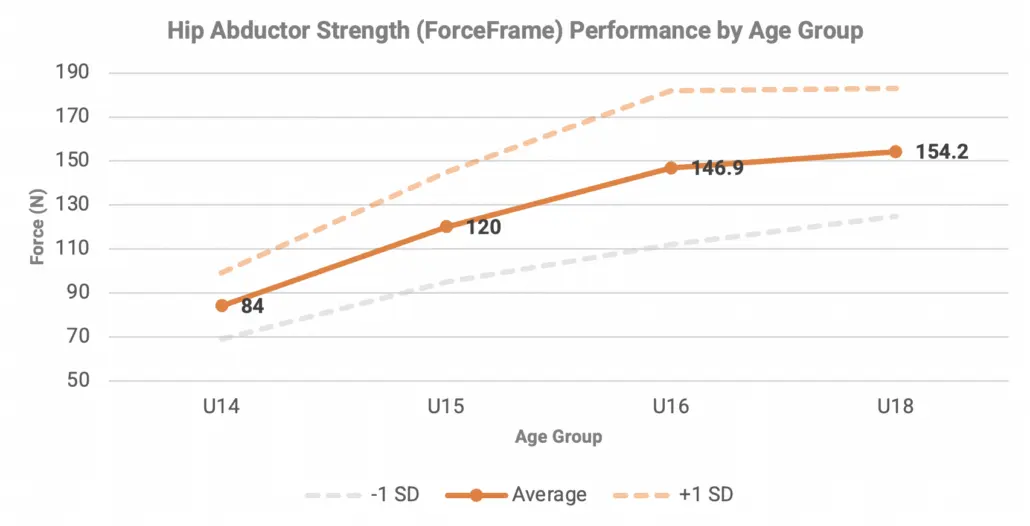 The team observed clear trends across the age cohorts they assessed, leading not only to the above mentioned insights on hip strength and pain, but also providing informative normative datasets that will form helpful reference points for future seasons.